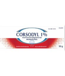 Corsodyl 10 mg/g munnholshlaup. Inniheldur klórhexidínglúkónat. Til sótthreinsunar fyrir og eftir munn- og tannaðgerðir. Tímabundin meðferð við munnbólgu af völdum gervitanna. Tímabundin meðferð til varnar bakteríum og tannsteini vegna tímabundinna sjúkdóma, slyss, mikillar tannsteinsmyndunar, tannholdsbólgu og tannslíðursbólgu. Lesið leiðbeiningar á pakkningu vandlega fyrir notkun. Sjá nánari upplýsingar um lyfið á www.serlyfjaskra.is.
